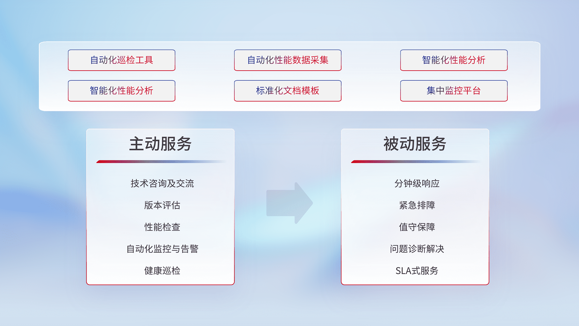 智能化工具和标准化文档,,,,保障服务质量,,,提供主动服务(包含技术咨询、、版本评估、、、、性能检查、、自动化监控与告警、、、健康巡检)和被动服务包含(分钟级响应、、紧急排障、、、、值守保障、、、、问题诊断解决、、SLA服务)。。。